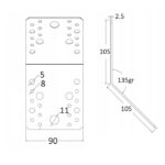 Colțarul metalic KLR5 este proiectat pentru fixarea a două elemente din lemn la un unghi de 135°, ideal în foișoare, acoperișuri, structuri decorative sau mobilier outdoor. Piesa are dimensiuni generoase 105 × 105 × 90 mm, este realizată din tablă de 2,5 mm și este protejată prin zincare Z275 pentru durabilitate la exterior.
